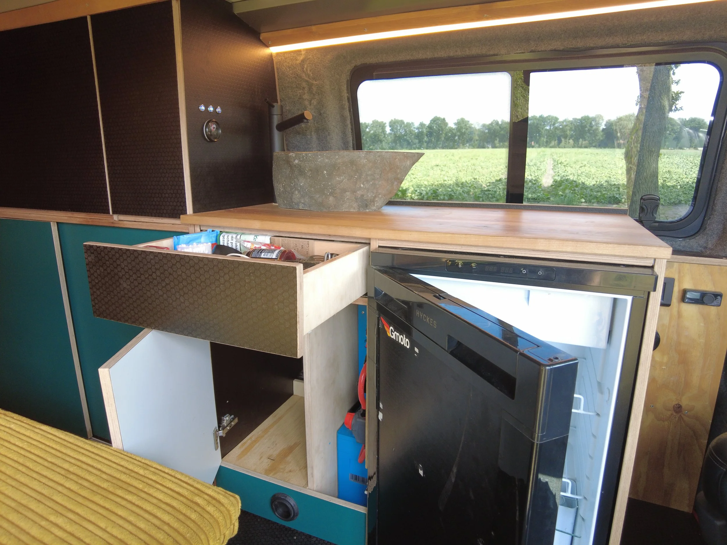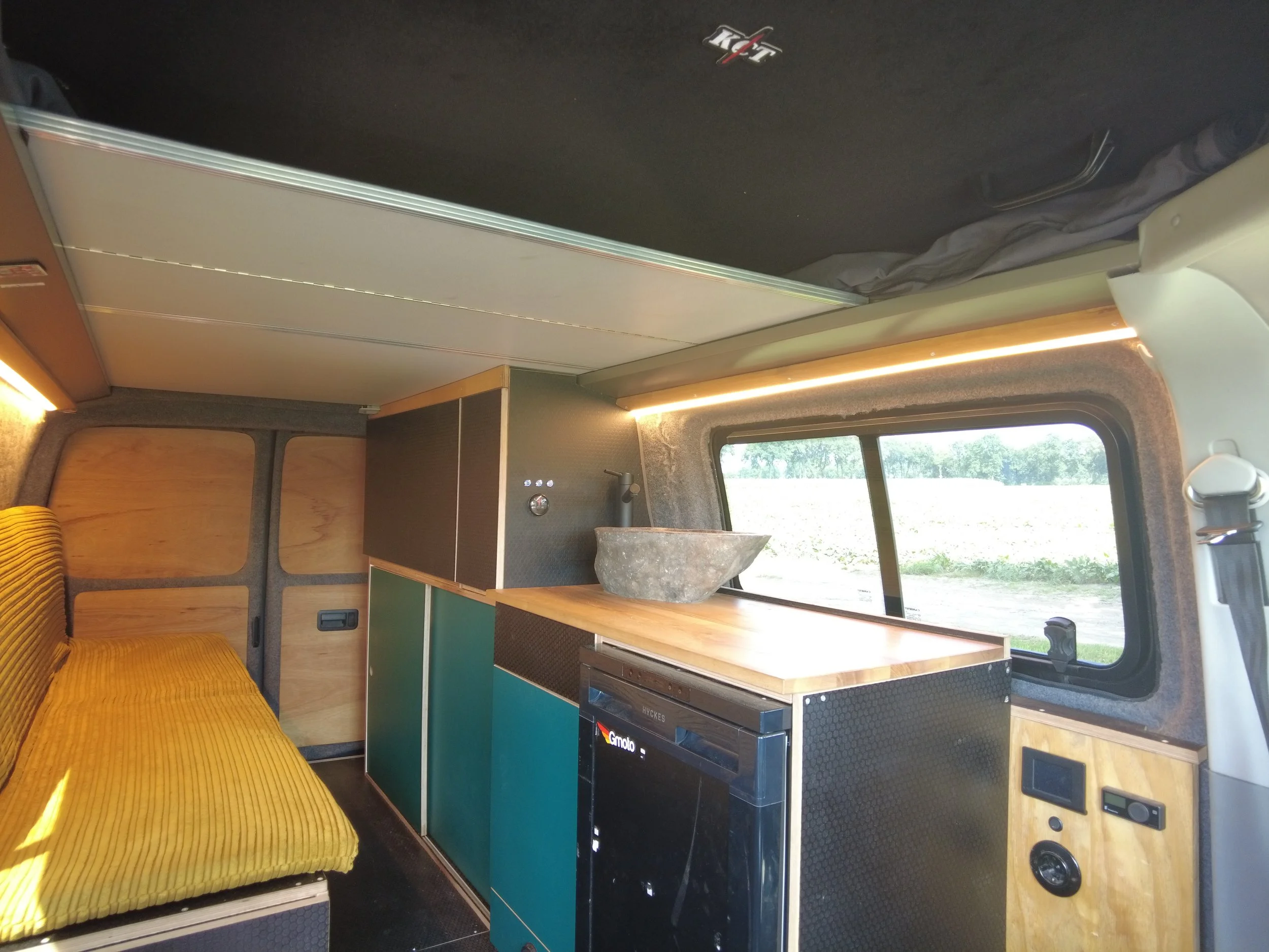 Bevat een bedbank, minimalistische keuken, dakventilator, koelkast, stroomvoorziening en noodtoilet.
